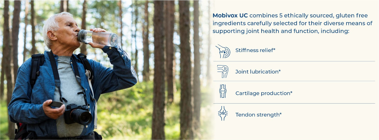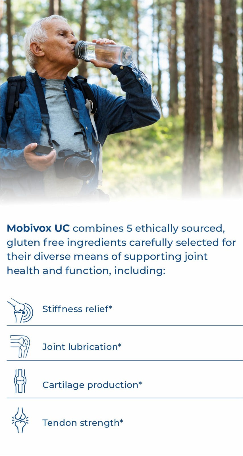 Mobivox UC brings these together in one clinically proven formula, so you can keep walking freely, climbing stairs with ease, and enjoying life without joint worries*