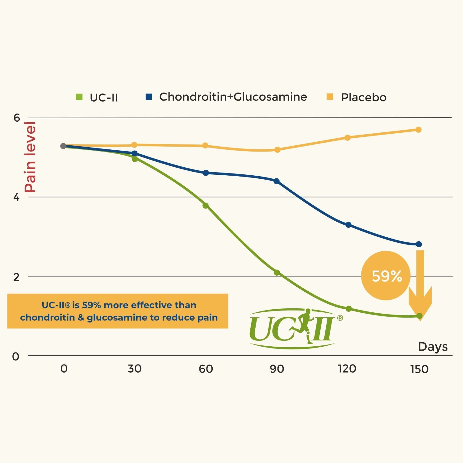 Several studies showed that UC-II® is 59% more effective than chondroitin and glucosamine in relieving from pain and discomfort.