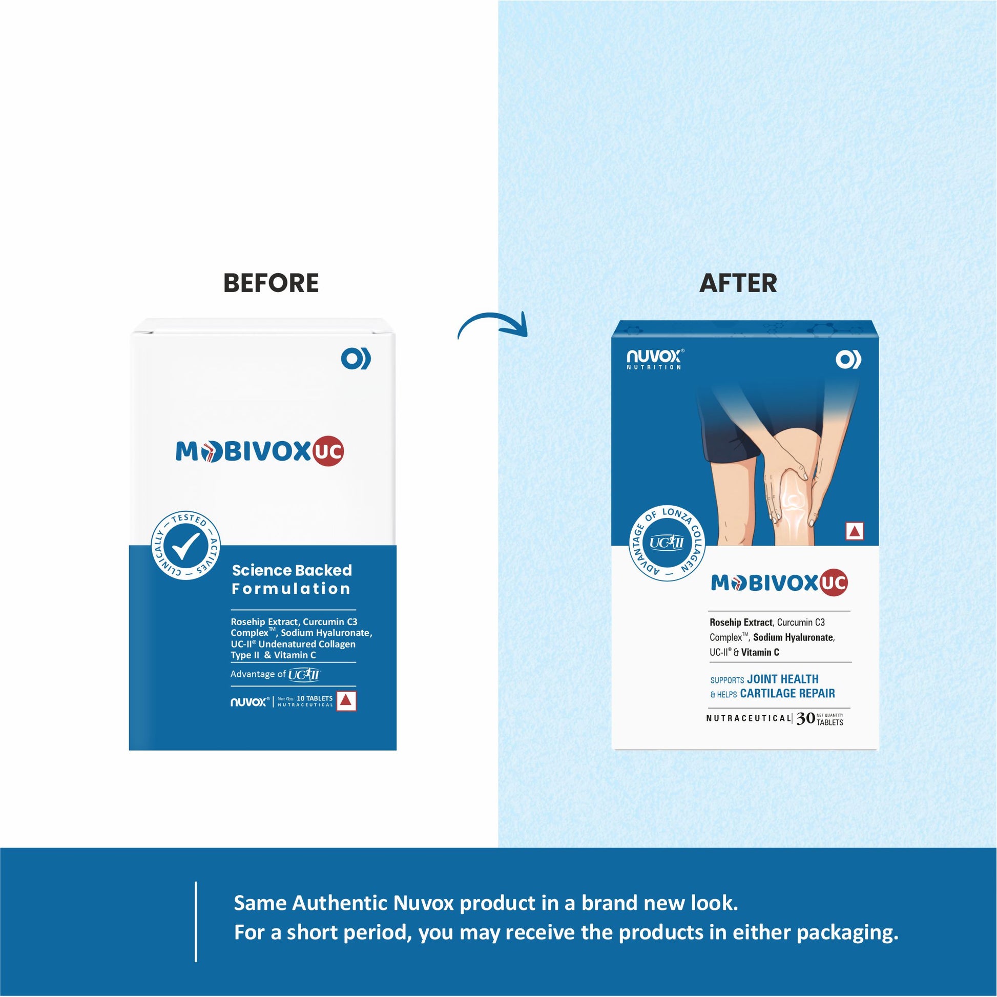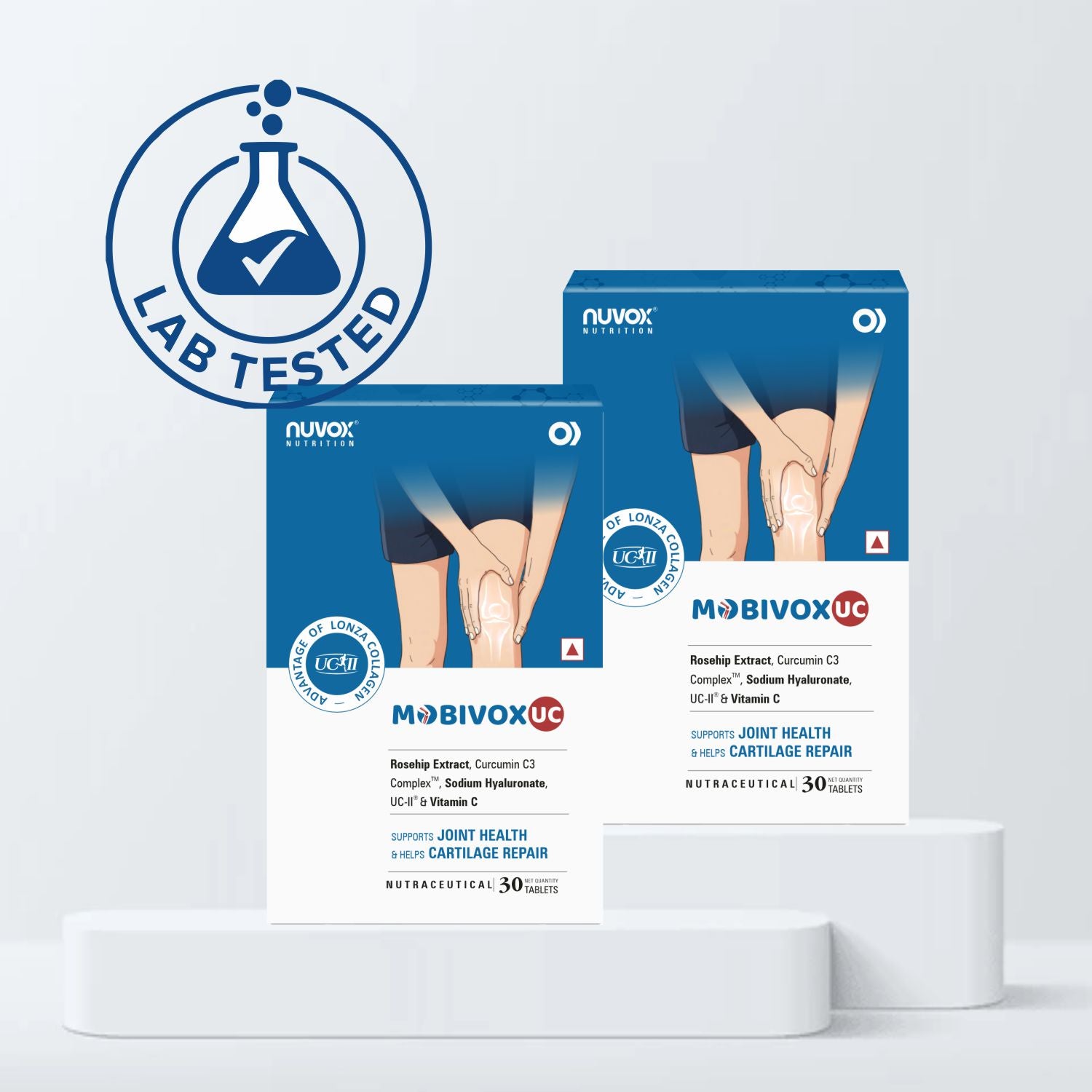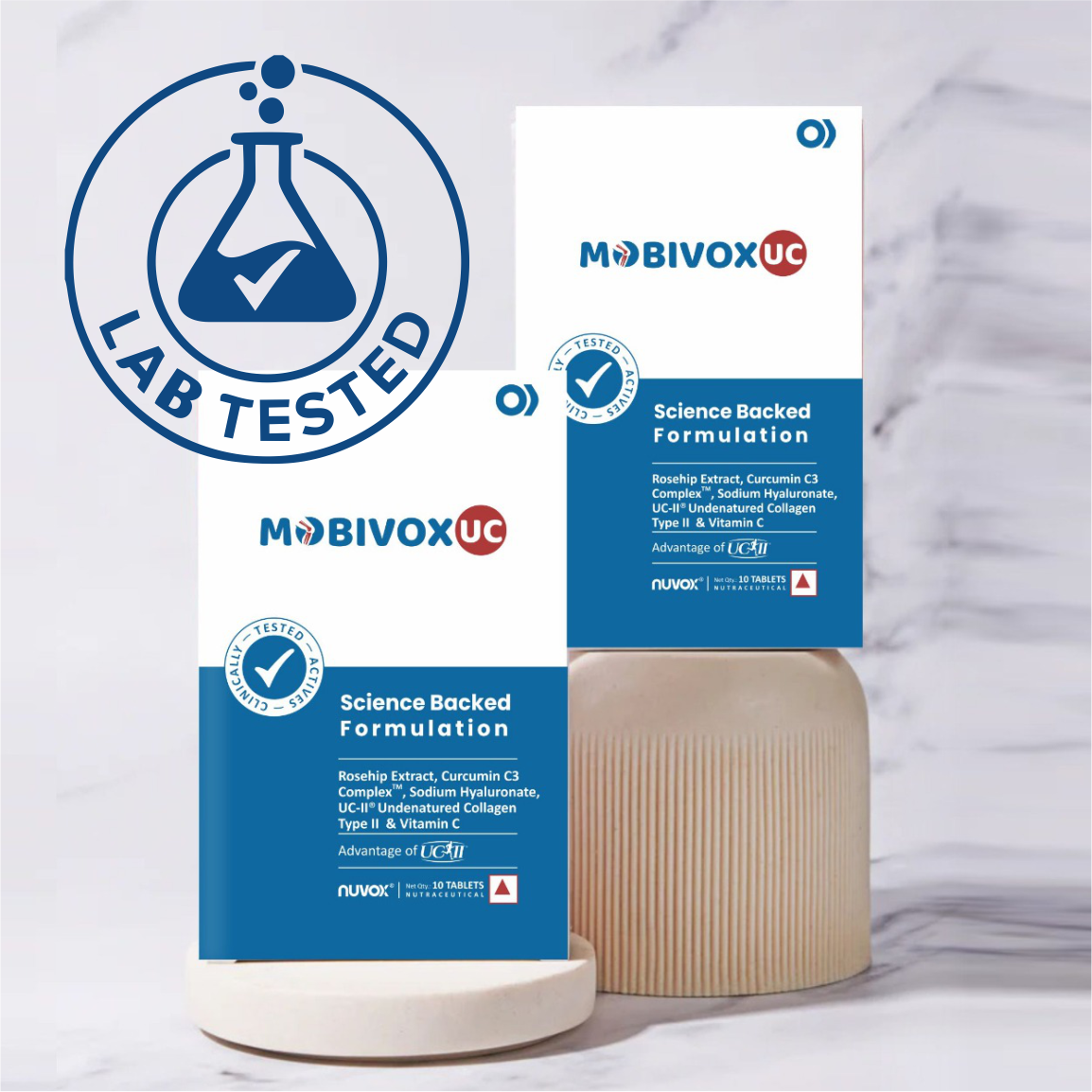Mobivox UC is a scientifically formulated joint health supplement containing Rosehip Extract, Curcumin C3 Complex™, Sodium Hyaluronate, UC-II® Undenatured Collagen Type II, and Vitamin C. It supports mobility, flexibility, and long-term joint comfort.