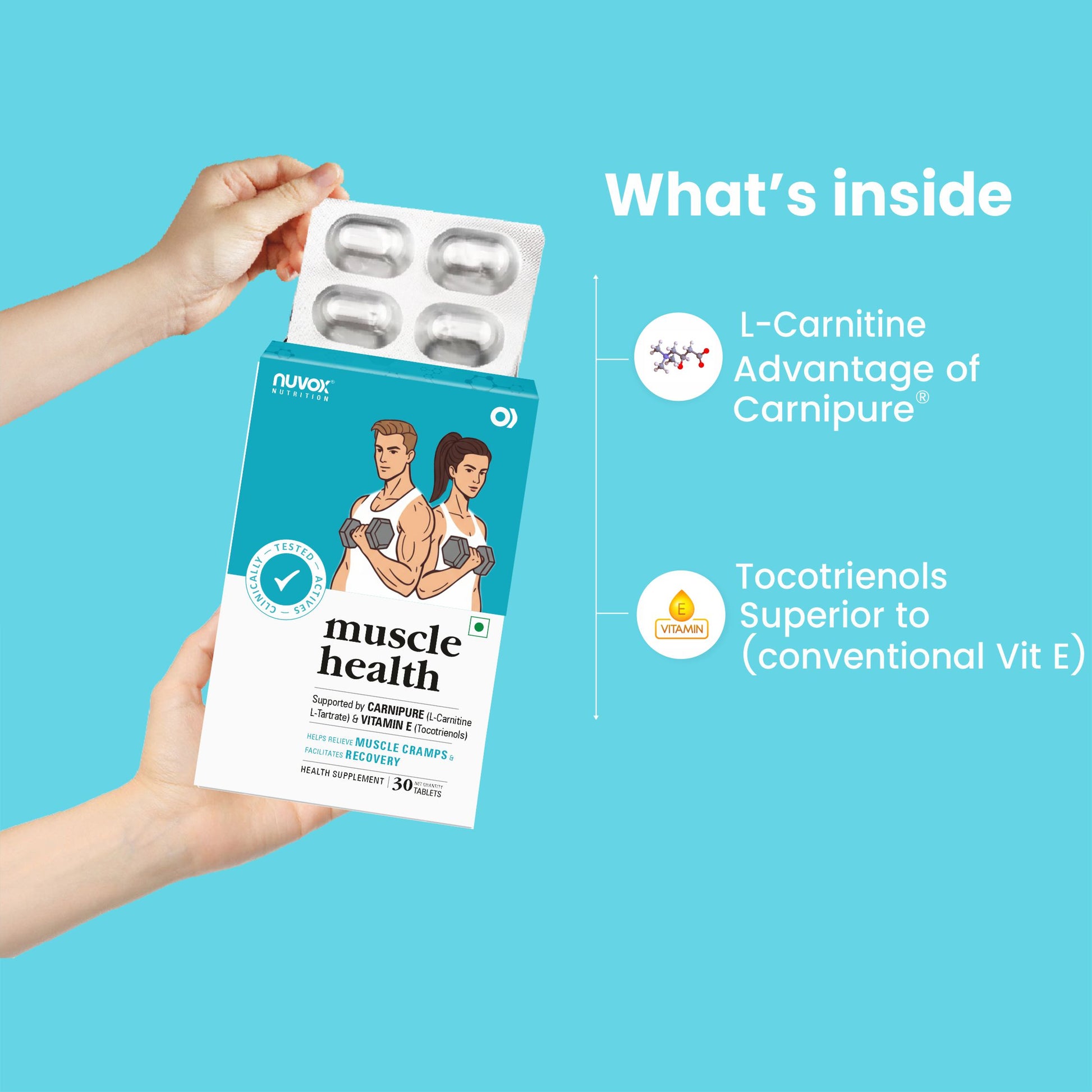 Nuvox Muscle Health is powered by Carnipure® L-Carnitine, L-Tartrate and Tocotrienols to enhance muscle strength, improve recovery, and reduce fatigue. It supports energy production, protects muscles from oxidative stress, and helps you stay active and strong every day.
